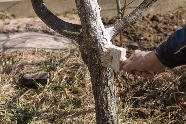 Когда и чем белить штамбы плодовых деревьев? Белить следует не только стволы, но и основания скелетных ветвей. Делается так с целью защиты от солнечных ожогов в зимне-весеннее время, это также и обеззараживающая мера против вредителей, зимующих в трещинах коры. Обычно побелку проводят осенью после листопада. Поскольку солнечные ожоги наибольшую опасность представляют в феврале-марте, побелку в это время возобновляют, если она была проведена некачественно и смыта дождями. Наиболее распространен следующий рецепт побелки: на 10 л воды 2–3 кг свежегашеной извести или мела, 1–2 кг глины, 50–100 г разогретого столярного клея, 200 г медного купороса. В продаже имеются и готовые различные водно-дисперсионные составы для побелки деревьев. Специалисты рекомендуют у молодых деревьев не красить штамбы и скелетные ветви, а оборачивать их мелкоячеистой синтетической сеткой, старыми светлыми капроновыми чулками или колготками. А вот взрослые деревья желательно побелить, но в начале вегетации побелку