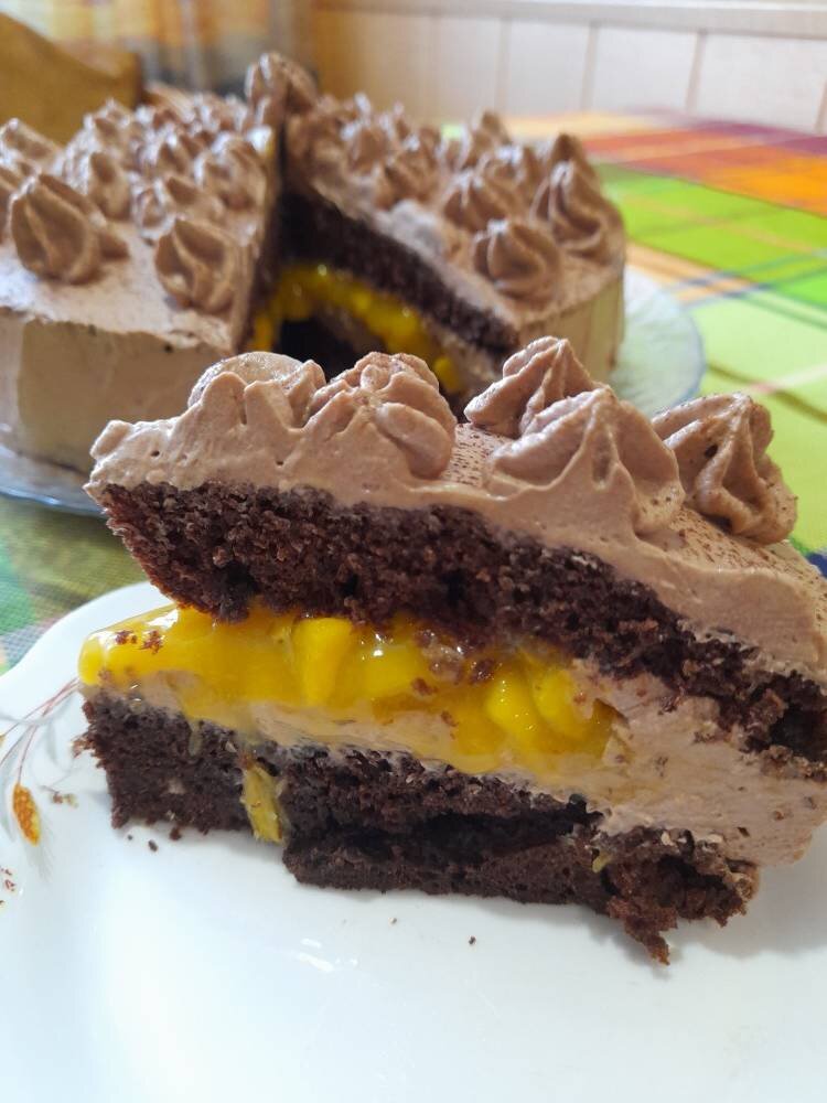 Вкусный шоколадный торт с сочным манго, соленым бисквитом и сладким кремом. Ингредиенты: Бисквит, Мука , Сахар , Какао, Сода , Соль , Яйца, Ванилин, Растительное масло, Молоко , Уксус , Крем, сливок 33%, Молочного шоколада, Компоте, Сахар , Пектин nh, Пюре манго , Манго кусочками , Лимонный сок Способ приготовления: Бисквит. В чаше соединить все сухие ингредиенты для бисквита. Добавить яйцо и остальные жидкие ингредиенты (кроме уксуса) комнатной температуры. Хорошо взбить. Добавить уксус и взбить ещё 2 минуты. Выпекать в форме диаметром 18-20 см при температуре 180' около 40 минут. Вынуть, остудить, обернуть в плёнку и отправить в холодильник минимум часа на 3,а лучше на 8. Крем. Половина необходимого количества сливок подогреть до 85'. Шоколад поломать на кубики. Горячими сливками залить шоколад и оставить на 2 минуты. Пробиваем миксером и доливаем оставшуюся половину холодных сливок. Снова взбиваем миксером. Накрываем плёнкой в контакт и отправляем на ночь в холодильник. В контакт-эт