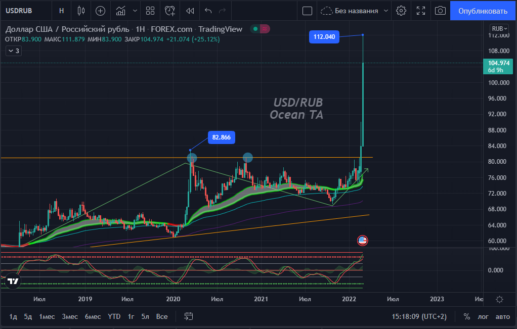 Центробанк повысил ключевую ставку до 20%. До этого ставка находилась на уровне 9,5%. Новое значение стало рекордом. В ЦБ пояснили, что для российской экономики кардинально изменились внешние условия — в отношении России введены гиперсанкции, которые до этого применялись лишь к Венесуэле, Сирии и Ирану. В ЦБ утверждают, что повышение ставки позволит поддержать финансовую и ценовую стабильность и защитить сбережения граждан от обесценения. С уровня 10-50% в годовом исчислении инфляция считается галопирующей. Гиперинфляция (выше 50%) возникает, когда государство «включает» печатный денежный станок для финансирования своих непомерных расходов. В ЦБ отметили, что дальнейшие повышение ключевой ставки будет происходить на основе поведения финансовых рынков. Для того, чтобы рынки вели себя надлежаще, Центробанк России временно запретил иностранцам продавать российские ценные бумаги. А тем временем сейчас рубль падает и соответственно в паре USD/RUB видим огромную недельную зеленою свечу. #