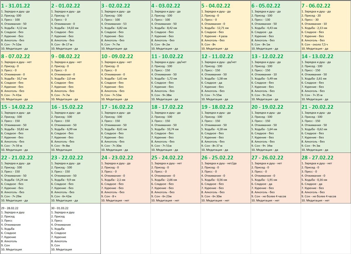 Состав челленджа Дни с 24 по 28 - не до челленджа. Давайте разберем все по пунктам поподробнее. Но для начала, список из моих 10 пунктов: Кратко по ощущениям 1. Зарядка и холодный душ В эти дни было не до зарядок и душей. Я в принципе прожил эти дни уткнувшись в телефон и новостные ленты. Проснулся и сразу в интернет... Но к слову, 2 раза холодной водой облился. Один раз после бассейна, второй раз на 28 день, сделал это чтобы просто остыть от потока негатива... Кстати, на пару минут хватило, но потом все по новой... 2. Приседания Сделал - 0 раз. 3. Пресс Сделал - 0 раз. 4. Отжимания Сделал - 0 раз. 5. Ходьба По ходьбе - особо вообще не двигался, если не считать, что был в бассейне 1 раз за это время. Все остальное время - за интернетом. Точные цифры - в таблице внизу. 6. Сладкое За это время было 2 дня, когда ел пирожки мамы, которые она приготовила для нас и передала, когда мы были у нее в гостях. Съел не много, сознательно себя ограничивал, но съел же. Значит - минус по 2 дням. Из в