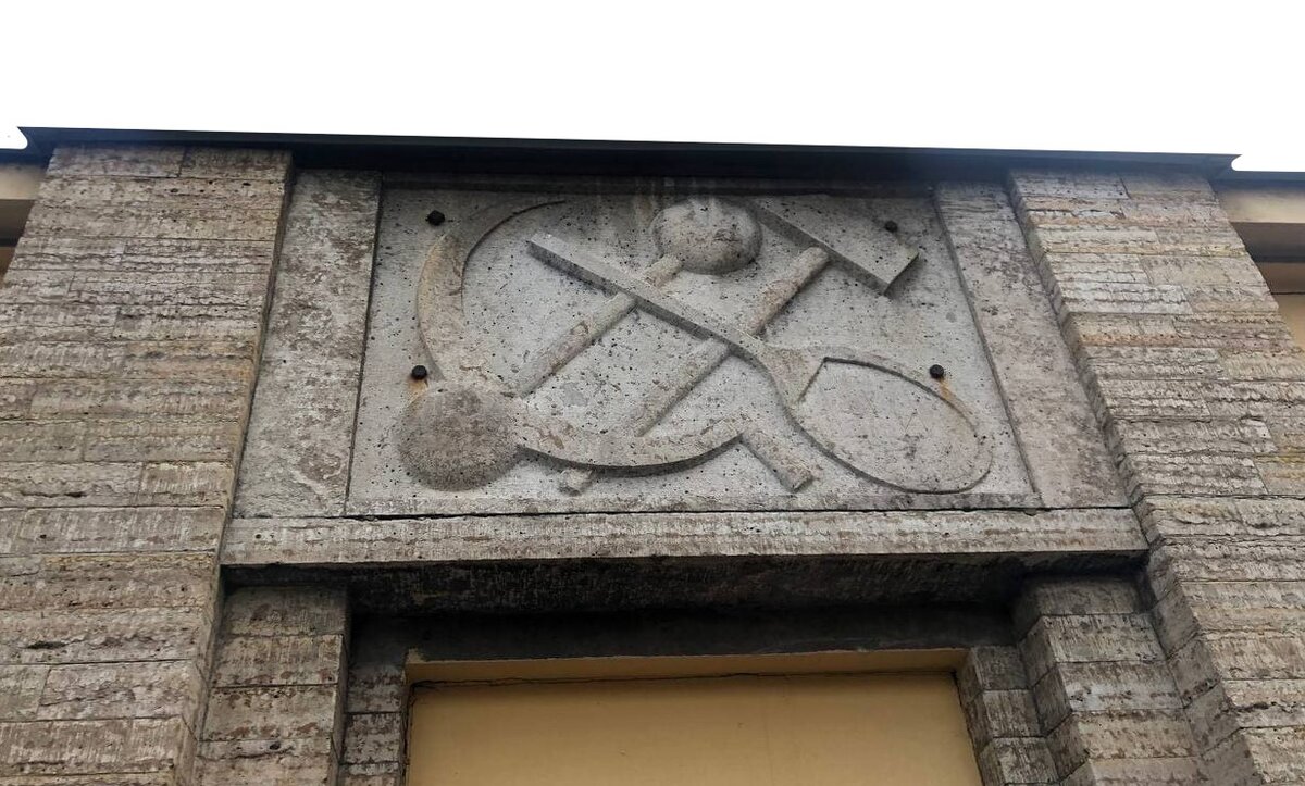 Любопытнейшая советская скульптура располагается на здании Школы имени 10-летия октября (ныне лицей №384) около метро Нарвская. Этот район комплексно застраивали в 1920-х годах. Здесь создавали утопический город-сад для пролетариев. Тогда же, в 1927 году на физкультурном зале школы появился этот барельеф, визуально далёкий от чистой эстетики нового стиля - конструктивизма. На изображении серпа и молота появилась гантеля и теннисная ракетка. И такое решение можно объяснить символически. Серп - это женский инструмент, а молот - мужской. Теннисная ракетка - женский спортивный снаряд, а гантеля - мужской. В тоже время серп и молот - это союз крестьян и рабочих, а ракетка и гантеля - символ группового и одиночного спорта, хотя возможно это лишь мои теории… Сама школа тоже заслуживает внимания. Здание проектировал архитектор Никольский А.С., который решил сооружение очень функционально и эргономично. Так например, классы начально школы были вынесены в отдельный корпус, что в то время было но