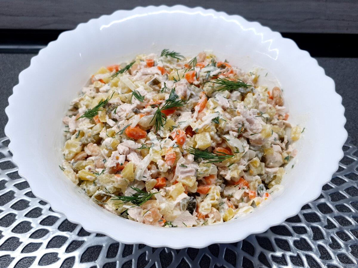Этот рецепт салата родился у меня в голове в тот момент, когда муж попросил приготовить "Оливье"(он у меня его любит больше всех на свете) а у меня в это время варилась куриная грудка. Собственно, я поняла, что продукты все есть и почему бы не приготовить то, что устроит и меня, и моего любителя классического Оливье) ИНГРЕДИЕНТЫ Картофель отварной в мундире 400гр. Морковь 1 шт.(100гр.) Куриная грудка 400гр. Огурцы солёные 550гр. Фасоль консервированная белая 1 банка. Лук репчатый 1 шт. Уксус или лимонный сок для маринования +соль, сахар Укроп 3 веточки Майонез Зернистая горчица Соль В первую очередь огурцы нарезаем мелким кубиком и откидываем в сито, чтобы они успели стечь. Иначе салат отсекнется. 🔪Куриную грудку отвариваем в соленой воде с луком. Нарезаем кубиком. 🔪Морковь отвариваем и нарезаем тоже мелким кубиком. 🔪 Репчатый лук режем пополам. Каждую половину на 3 части и нарезаем тонкой соломкой. Маринуем.Я готовлю лук вот таким способом за 2 минуты Фасоль из банки промыва