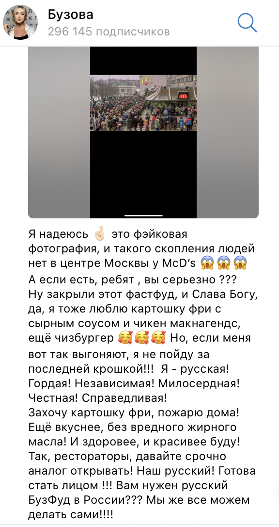 Даже Бузова не выдержала и спустилась с вершин своего успешного успеха, чтобы поддержать опечаленные толпы людей, оставшихся без картошки фри.