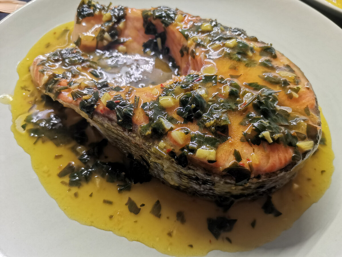 Подаём рыбу к столу поливая соусом.