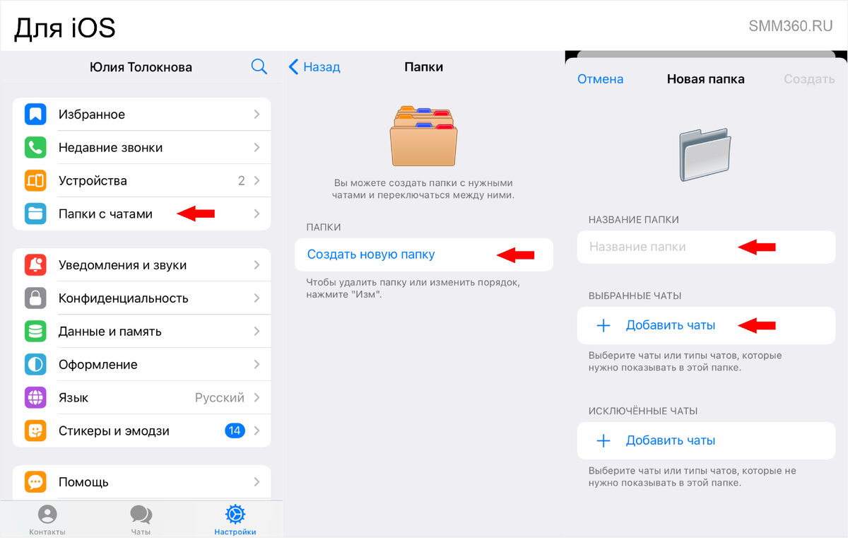 Приветствую, друзья! Как не потеряться в большом потоке Telegram-каналов? Рекомендую упорядочить все каналы по папкам. Так вы легко сможете найти тот, который нужен и не будете отвлекаться каждый раз на уведомления. Инструкция для iOS Инструкция для Android Готово! Теперь все ваши чаты будут структурированы и вы не потеряете нужный вам контент. Подписываетесь на наши запасные площадки. Там мы тоже делимся полезными новостями и полезной информацией о развитии и продвижении ваших аккаунтов и бизнеса в целом. P.S. Напомню, что у нас есть сайт SMM360.RU, на котором в ближайшее время также появится блог и новые полезные (бесплатные и платные) материалы.