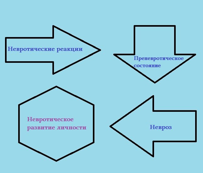При развитии невроза наблюдается следующая динамика: невротические реакции — преневротические состояния – невроз — невротическое развитие личности Невротические реакции обычно наблюдаются у людей, у которых с раннего детства отмечались признаки невропатии, такие как: беспокойный сон, плохой аппетит, капризность, пугливость, плаксивость, ночные страхи, ночной энурез, заикание и подобные состояния. Типичными чертами являются также повышенная утомляемость, раздражительность и ипохондричность. Преневротические состояния характеризуются быстро преходящими аффективными, фобическими и вегетативными проявлениями. Отмечаются нестойкие страхи, истощаемость, трудность сосредоточиться, нежелание работать, появление раздражительности при необходимости продолжать работу, обидчивость, плаксивость. Появляются суетливость, неприятные ощущения при необходимости выполнять мелкие и точные движения и при необходимости долго сохранять неподвижность, утрачиваются быстрота и ловкость. Наблюдаются потливость,