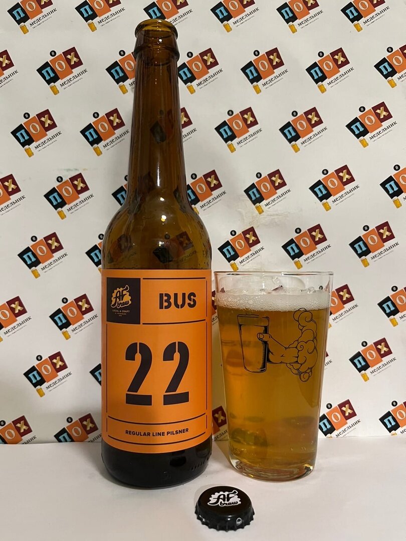 Статистика: пиво непастеризованное нефильтрованное светлое, объемная доля спирта - не менее 4,5%, экстрактивность начального сусла - 13,0%, состав: вода, солод ячменный светлый, хмель, дрожжи. Объём: 0,5 л Дата розлива: 16.11.2021 Изготовитель: ООО «АФ Брю», Россия, г. Санкт-Петербург По-братски: маршрут автобуса 22 в Санкт-Петербурге начинается на улице Стасовой и заканчивается на улице Двинская. Признаться честно, я знать не знаю где это и какой у него длины маршрут. Но могу сказать одно, на этом маршруте в Питере работают автобусы большой вместимости Volgabus построенные в городе Волжский (это в получасе езды из Волгограда). Теперь о пиве. На этикетке нам сообщают о том, что это регулярная линия пилснера. Хорошо, присаживайтесь, оплачивайте за проезд и поехали. При наливе в бокал хорошо ощущается богатый аромат хмеля, пенная шапка не сильно сложилась, вкус у него прям реально, в лучших традициях стиля, есть весомая горечь, есть некая сухость, лёгкая карбонизация, в послевкусие гореч