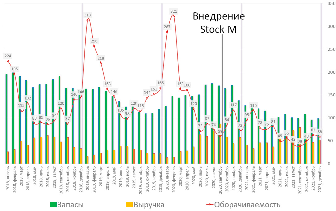 За год внедрения компания сократила запасы на 30% и увеличила их оборачиваемость в два раза. Впервые вошла в низкий сезон без ухудшения оборачиваемости. За счет собственных средств, высвобожденных из запасов, инвестировала рекордные средства в новое оборудование и модернизацию существующего. Подробные диаграммы с показателями в статье.