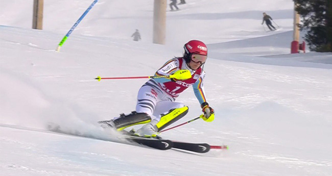 Андрея Слокар по идее должна становиться новы лидером, у словенки достаточно опыта и она умеет ходить слалом. В Леви в том сезоне она была четвертой. Словенка увеличивает отрыв на двух отрезках подряд, везет 49 сотых, потом 55 сотых. И что внизу? Эх, только третья! Уступила 14 сотых Труппе и 10 сотых – Мейяр. Даже не верится, начало было многообещающим.