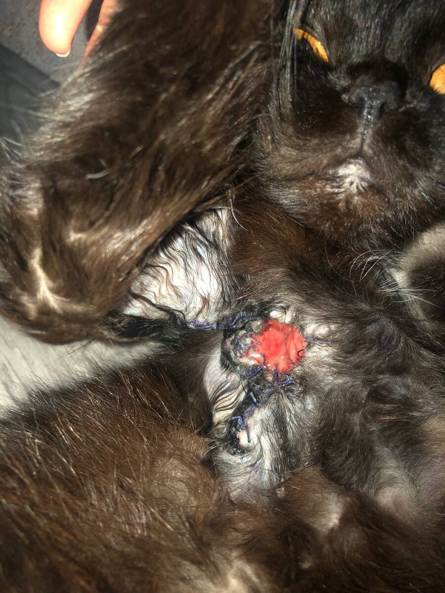 У меня был выходной день, дети (мои младшие сестры) игрались во дворе и вдруг ко мне подбегает младший ребенок и говорит, что во дворе ходит черный котик. Я сначала не обращала внимания, занималась своими делами, но позже мне стало интересно и я решила посмотреть на котика. Увидев её, было сразу понятно, что она раненная. В районе подмышки у нее был огромный порез доходящей до лапы, было мало шерсти, поэтому сначала подумала, что у нее ожог. Я не смогла оставить её в таком состоянии на улице и решила понести её к ветеринару. Он сказал, что это не ожог, а разрыв. Позже выяснилось от соседей, что на кошке был ошейник и одна лапа пролезла через него, В связи с чем, ошейник придавил её и порвал кожу на подмышке. Ветеринар обработал рану и отправил нас домой, потому что кошка была настолько истощена,