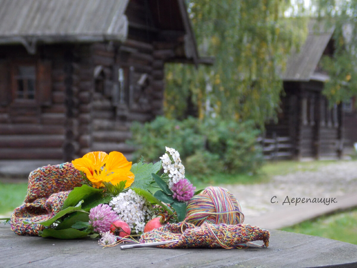 Музей деревянного зодчества, крылечко столетней избы. Вяжу сумочку.