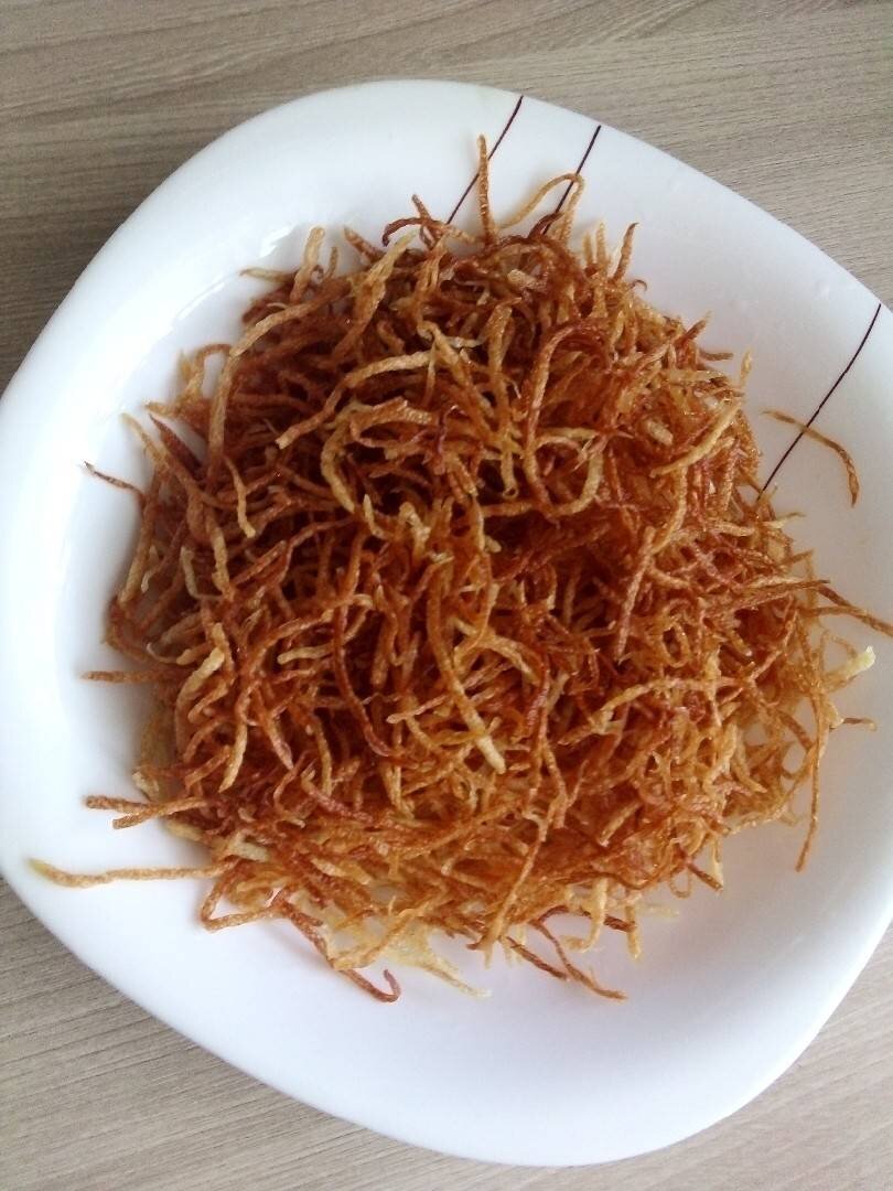 #пост Ингредиенты: Крупные картошки, Вода для промывания, Соль , Растительного масла Способ приготовления: Картошку очистить и натереть на тёрке для моркови по-корейски. Промыть несколько раз под проточной водой, так чтобы вода была прозрачной, а не белой. Выложить в дуршлаг, чтобы стекла лишняя жидкость, обсушить бумажным полотенцем, выложить в тарелку и посолить по вкусу. В сковороду налить масло и хорошо разогреть, небольшими порциями выкладывать картофель и обжаривать до золотистого цвета, жарится быстро, нужно периодически помешивать. Готовый картофель выложить на бумажное полотенце, чтобы стек лишний жир. Готово. Можно украшать салаты или другие блюда, а можно и есть так. Приятного аппетита.