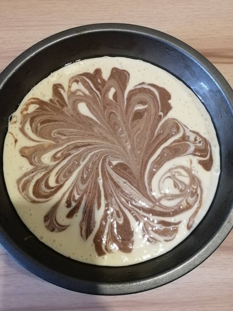 Ингредиенты: яйца, сахара, муки, растительного масла, ванилина, разрыхлителя, какао Способ приготовления: Взбить яйца до бела. Добавить сахар и взбивать пока масса не увеличиться в объёме в двое. Добавить растительное масло. Добавить муку, перемешать. Положить ванилин и разрыхлитель. Всё смешать. Немного теста отложить, добавить в него какао и перемешать. В смазанную форму вылить белое тесто, потом сверху - тёмное и немного смешать. Поставить в разогретую духовку на 30 минут, при температуре 160°С. Ваша зебра готова, приятного аппетита 😘.