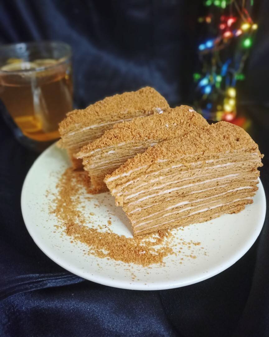 Самый вкусный, нежный, проверенный годами рецепт медовика❤️ Ингредиенты: Для теста:, Яйца , Сахар , Соль , Масло сливочное , Мед , Сода , Мука , Ванильный сахар Способ приготовления: Для сметанного крема: 1. Сметана 20% - 800 гр. 2. Сахарная пудра - 200-250 гр. Готовим тесто: 1.В сотейнике соединяем яйца с сахаром и щепоткой соли. Перемешиваем до однородности. 2. К яйцам добавляем мед и сливочное масло и ставим на огонь. 3. На среднем огне, постоянно помешивая, доводим до кипения. Как только появились первые "бульки", снимаем с огня (иначе, яйца могут свернуться). 4. Постоянно помешивая, добавляем соду. Масса должна будет подняться. 5. Частями добавить просеянную муку и замесить тесто. 6. Не добавляйте больше муки, чем указано в рецепте, иначе, при выпекании, оно может стать твердым. 7. Убираем в холодильник на 4 часа. После того, как тесто полежит в холодильнике, оно станет более твердым и с ним удобно будет работать. 8. Достать тесто и разделить его на 8-10 частей. 9. Раскатать, прид