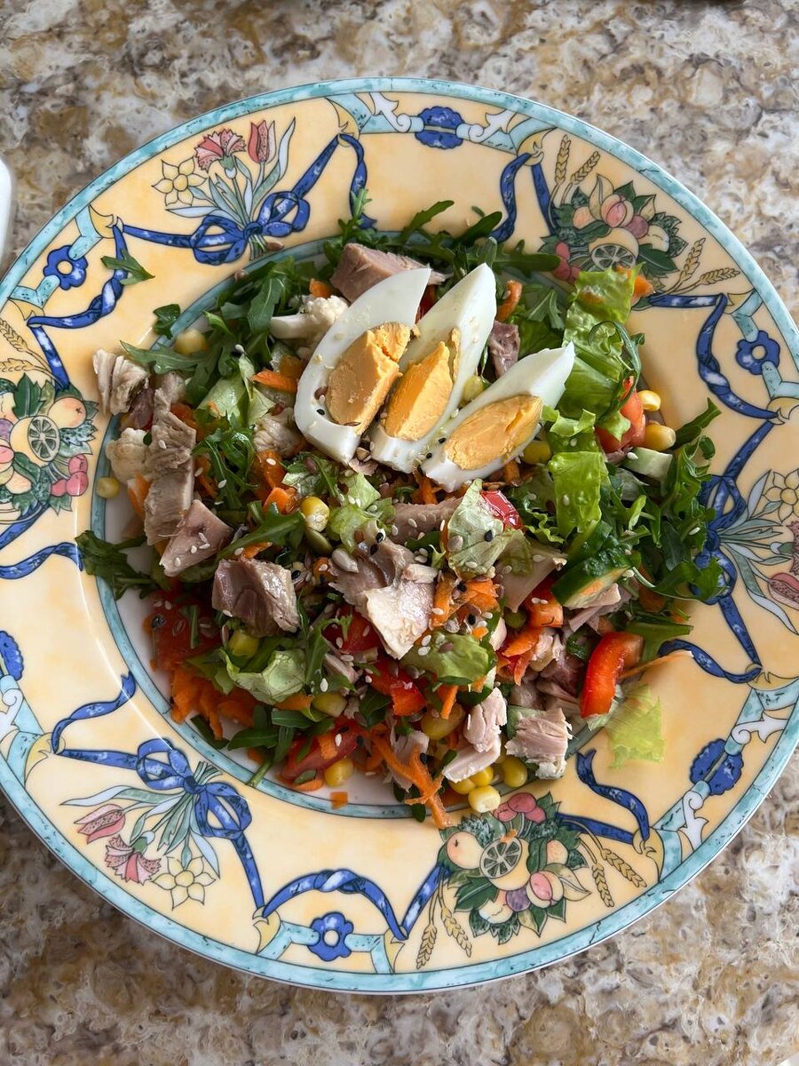 Я часто показываю свою еду! Последнее время в телеграмм выложено все, что я ем в течение дня https://t.me/drAsiyatKh Очень люблю на скорую руку состряпать салатик. ☺️ И неизменно приходят вопросы- из чего салат? Говорю как есть! Из всего того, что в холодильнике 😂🙈 но по методу тарелки ☺️ 1️⃣ Зелень и овощи! Любые и много! Обязательно 🤗 это клетчатка и фитонутриенты! Все, что есть в холодильнике. У меня вчера руккола, салатные листья обыкновенные, огурец, помидор, перец болгарский, морковь (натерла на терке), цветная капуста (сырая). 2️⃣ Белковая часть - у меня было отварное мясо курицы и яйца. Можно консервированную рыбу например или растительный белок- фасоль или нут (можно сделать заготовки и отварить или использовать из банки) 3️⃣ Углеводы - у меня подучилась кукуруза. Она является крахмалистым продуктом, поэтому относим ее к углеводам. Можно любую отварную крупу или короткие макароны. 4️⃣ Жиры - семечки и растительное масло. Для разнообразия вкуса можно поэкспериментирова