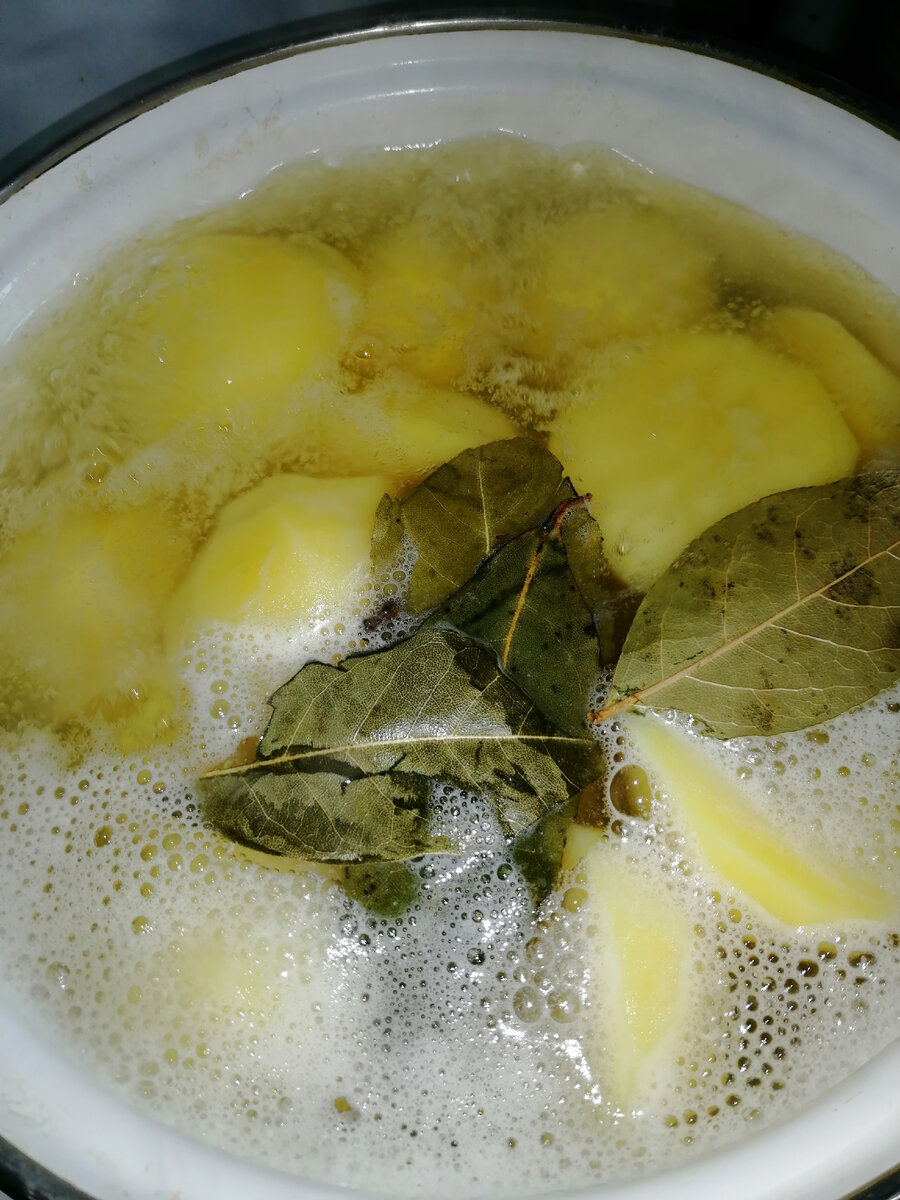 - Отвариваем 1,5 кг. очищеного и нарезанного на четвертинки картофеля с добавлением 3 - 4 листочков лаврушки и 5 - 7 горошин чёрного перца.