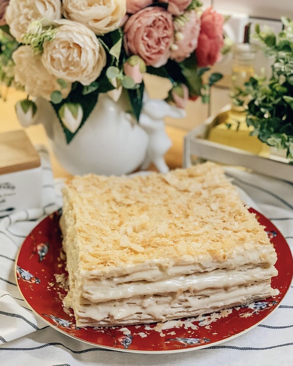 Ингредиенты: 🫓слоеное бездрожжевое тесто 2 пачки(4 пласта) 🥛сгущенка 1 банка 🧈сливочное масло 200 г 🍶-🍰-🥚-🍯-🥛-🧁-🍶-🍰-🥚-🍯-🥛-🧁-🍶-🍰- ▪️Перед началом приготовления тесто следует достать из морозильной камеры и дать ему немного оттаять. ▪️Также заранее достаем сливочное масло из холодильника, чтобы оно размягчилось при комнатной температуре. ▪️Выкладываем 2 пласта теста на противень, покрытый пергаментной бумагой и делаем много проколов для того, чтобы тесто равномерно поднялось во время выпечки. ▪️Отправляем противень в разогретую до 190 градусов духовку и выпекаем коржи 10-15 минут. Нам нужно будет приготовить таким образом 4 коржа. То есть выпекаем два противня коржей. ▪️Пока коржи пекутся, готовим крем для торта. В миске смешиваем размягченное сливочное масло,сгущенное молоко и взбиваем это все до однородности. Убираем полученный крем в холодильник до того времени, когда выпеченные коржи полностью остынут. ▪️Еще горячим каждый корж разрезаем вдоль пополам ножом для