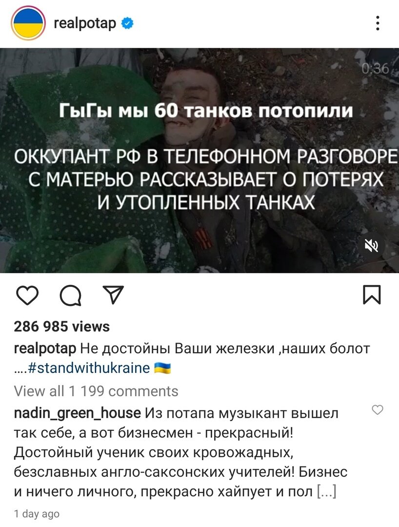 На примере странички в инстаграм широко известного в узких кругах музыканта потапа. Из потапа музыкант вышел так себе, а вот бизнесмен - прекрасный! Достойный ученик своих кровожадных, бесславных англо-саксонских учителей! Бизнес и ничего личного, прекрасно хайпует и получает свои 30 серебренников... Иуды были и будут всегда в любом народе, но с каким удовольствием вы озверели, выжигая из себя славян потеряли человечность, нам это видеть от вас уже привычно, но то чем стали вы за последние 8 лет... Вы, в угоду англосаксов, убиваете русских, размножаете нацистов, толпой линчуете и убиваете привязанных к столбам людей, измываетесь и убиваете тех, кто не против России, бомбили и проводили диверсии в Донбассе и считали это "славным хероизмом", сожгли людей в Одессе и славили "хероев", которые это сделали, улюлюкаете и скачите как гиены над униженным, растерзанным человеком, не выпускаете мирных жителей и дезинформируете их, всего в таком сообщении и не перечесть... Вы способны на что угодн