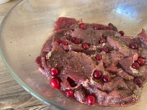 Как-то раз нам подарили кусочек оленины. Что с ней делать мы честно не знали, но решили попробовать. Кусок оленины разморозили при комнатной температуре. Порезали на стейки (2 см) и отбили. Маринуется такое меся достаточно долго. Для маринада взяли: перец, хмели-сунели и клюкву. Соль добавили непосредственно перед жаркой. Мясо мариновалось ночь. Посолили и начинаем жарить в мульпекаре. Что могу сказать. На вкус никакого неприятного запаха и вкуса нет. Мясо немного жестковато, но получилось необычно. В следующий раз будем делать шашлык из оленины. Приятного аппетита. Кстати если у вас есть свой рецепт что приготовить из оленины - пишите. Буду рада.