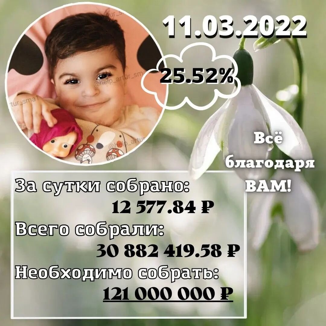 @help_artur_sma1: Отчёт 💰 на 11.03.2022г За сегодняшний день собрано: 12 577.84 ₽ На личные счета родителей за сутки поступило: 12 577.84 ₽ СберБанк 7 878.84₽ РНКБ 0₽ PayPal 0 ₽ Тинькофф 4 699 ₽ Qiwi 0 ₽ PayPal (DEUTSCH) 0 ₽ На счета фондов за сутки поступило: 0 ₽ БФ "Помогать Легко" 0₽ БФ "Подари Шанс" 0₽ БФ"Марии Леонтьевой" 0 ₽ БФ "Будущее Якутии" 0 ₽ БФ "Gofundme" 0₽ Всего собрано : 30 882 419.58 ₽ На счетах родителей всего: 6 764 618,58₽ СберБанк 5 759 013.11 ₽ РНКБ 211 327,83 ₽ PayPal 806,17 ₽ Тинькофф 684 287.30 ₽ Qiwi 11 711,46 ₽ PayPal Deutsch 97 472,71 ₽ Из них всего в Фондах: 24 117 801 ₽ БФ «Помогать Легко» 22 916 762 ₽ БФ «Подари Шанс» 1 079 695 ₽ БФ"Марии Леонтьевой" 74 856₽ БФ "Будущее Якутии" 25 987₽ БФ "Gofundme" 20 501 ₽ Всё это стало возможным благодаря вам!!! Каждому, кто переводил 50, 100, 200 и более рублей! Огромное количество людей откликнулись и совершили маленькое чудо: доказали, что помощи маленькой не бывает!!! Что вместе нам всё под силу!!! 🙏🏻