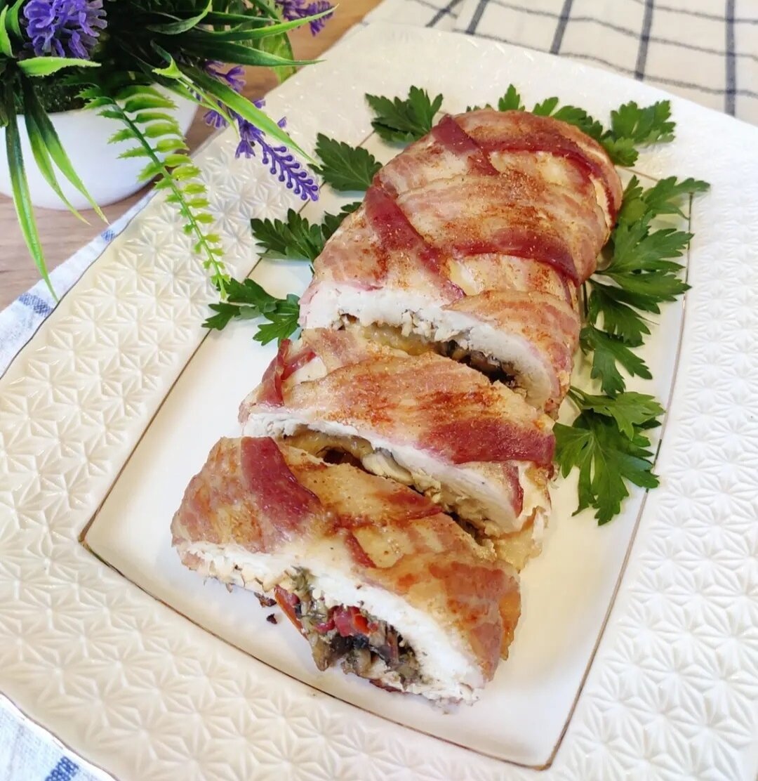 Куриное филе отбиваем, выкладываем на пищевую пленку (как показано в карусели 👉) Посыпаем любимыми специями. Выкладываем обжаренные грибы, помидоры, зелень и сыр. И аккуратно сварачиваем в рулет. Далее, крест на крест выкладываем бекон и отправляем в духовку на минут 40... Это оооочень вкусно🤤