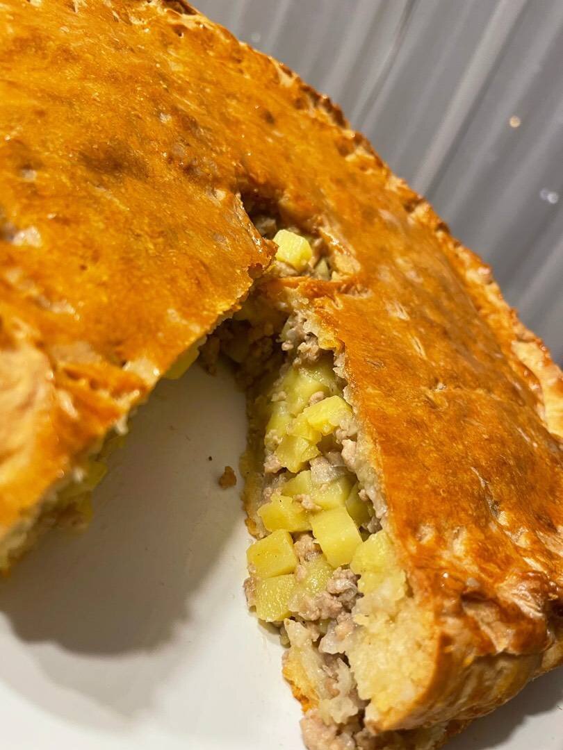 Ингредиенты: Для теста:, маргарин, тёплого молока, сода, мука пшеничная, яйцо, Для начинки:, Свинина (мякоть) или фарш, Картофель, Лук репчатый, Соль, Укроп свежий по желанию, Перец молотый Способ приготовления: Начинаем с замеса теста. Растапливаем маргарин, остужаем, переливаем в миску. К растопленному маргарину вливаем тёплое молоко и подсыпаем немного соды. Небольшими порциями начинаем подсыпать пшеничную муку. Одновременно добавляем соль. Замешиваем тесто для пирога, оно получится эластичным. Отставим пока тесто в сторону. Готовим начинку. Очищаем картофель, измельчаем в форме мелких кубиков. Свинину (чуть подмороженную) нарезаем аналогично, либо размораживаем фарш. Добавляем рубленый репчатый лук и свежий укроп по желанию. Приправляем начинку солью. При желании можно еще добавить молотый черный перец. Ингредиенты начинки перемешиваем. Включаем духовой шкаф, разогреваем до 180 градусов. Тесто для пирога делим на две неравные части. Большую часть - это основание мясного пирога - ра