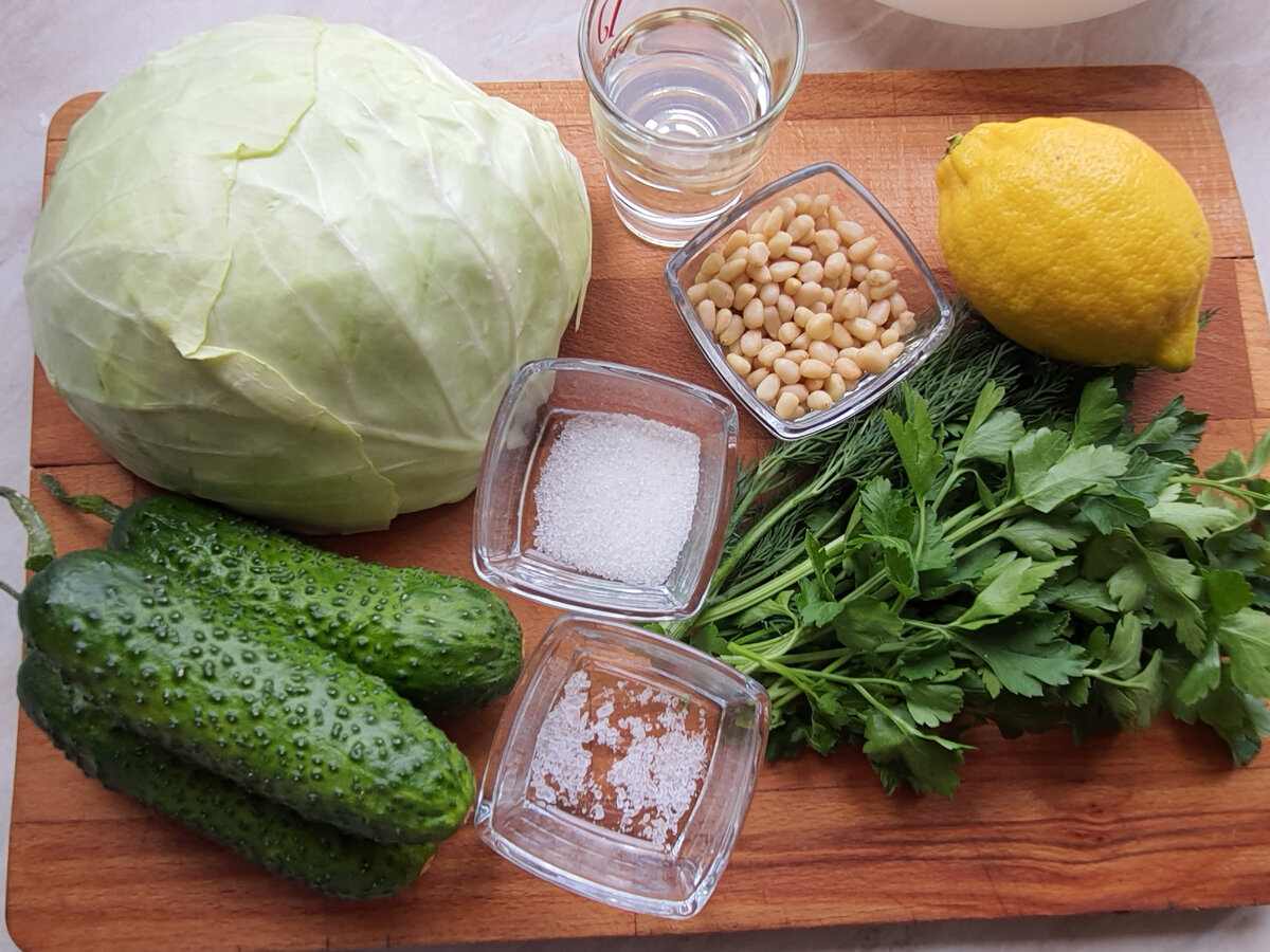 Салатик "Похудейку" готовлю уже давно, лет 15 наверное. Раньше основной его ценитель и потребитель был старший сын, который занимался самбо и перед соревнованиями регулярно сгонял вес. Спортсмены вообще народ суровый, как они избавляются от лишних килограммов, я бы так не смогла. Поэтому поддерживала ребёнка, как могла -- полезной и вкусной едой. Ну а сейчас себе готовлю и домашним. Мы его очень любим, особенно весной, когда в продаже появляется молодая капуста. Он очень прост в приготовлении. И набор ингредиентов тоже доступный. Сочная белокачанная капуста,огурцы свежие, свежая зелень, кедровые орешки, соль,сахар, лимонный сок и растительное масло. Капусту нашинковать как можно тоньше, затем помять хорошо с солью, посыпать сахаром, полить лимонным соком и перемешать. Затем порезать огурцы тонкими ломтиками. Это важно, потому что салат должен быть сочным. Затем выложить огурцы в салатник, перемешать и попробовать на соль-сахар-кислоту. Если баланс вкусов устраивает, то продолжаем гот
