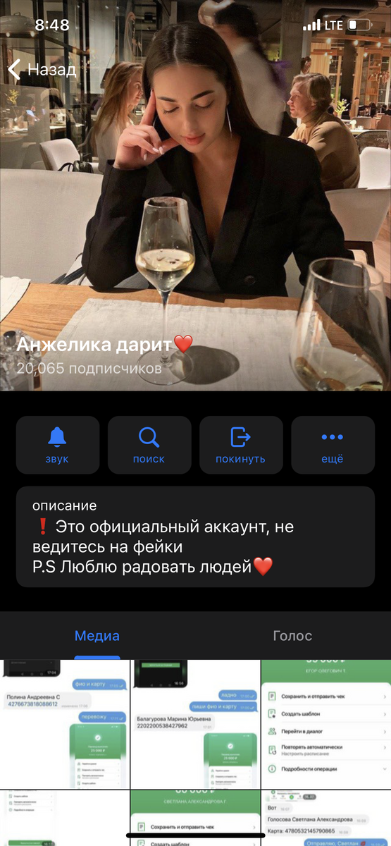 Зашла через рекламу на канал к некой Анжелике, якобы она раздаёт деньги 💵 Решила проверить. На канале все просто и незамысловато написано о доверии к их компании, которая занимается рекламой, к тому же подписчиков на канале много. Через Телеметр проверила - канал быстро развивается.