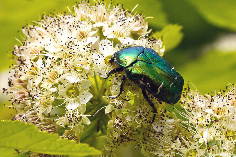 Внешнее строение Тело жука состоит из трёх отделов - голова, грудь и брюшко. Снаружи тело покрыто крепкой и эластичной кутикулой. Она составляет внешний скелет насекомых - экзоскелет. На голове золотистой бронзовки мы видим пару усиков или антенн, пару сложных глаз и рот. Глаза На окружающий мир эти жуки смотрят сложными глазами. Состоят они из большого количества отдельных глазков - омматидиев. Это шестигранники на поверхности глаза насекомого. Каждый из них фиксирует крошечный участок перед собой. Поэтому бронзовки видят всё, как пазл, собранный из большого количества маленьких картинок. Усики расчленены на сегменты, а на концах у них выросты в форме пластинок. Именно из-за них своё название получило целое семейство жуков - пластинчатоусые. Усики у жука выполняют ту же роль, что и наш человеческий нос - отвечают за обоняние. Усики Растут на голове между глаз. Имеют 3 основных части - рукоятку (скапус), ножку (педицеллум) и жгутик (флагеллум). Последний представлен члениками в форме п