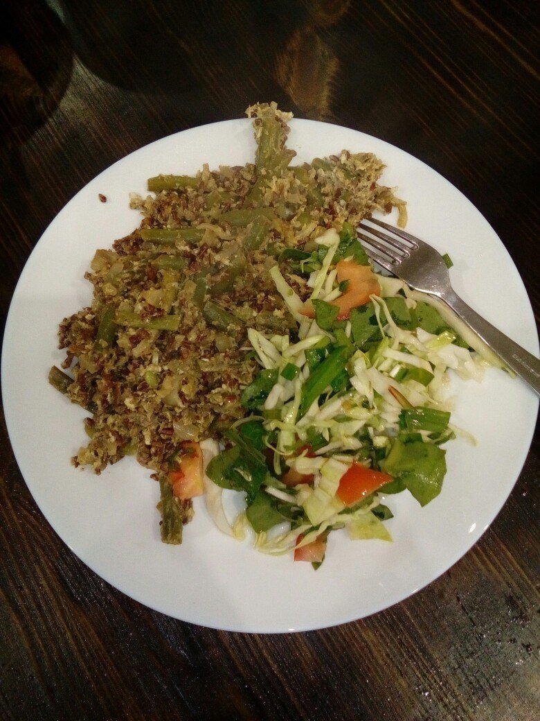 Когда вся эта масса нажарилась кидаем туда стручковую фасоль, втыкаем огонь посильнее и часто перекрещивая поджариваем фасоль. В это же время кидаем специи, какие нравятся можно побольше.Пробуем фасольки, мягкие? Тогда кидаем 3-4 яйца и активно теряя калории перемешиваем.