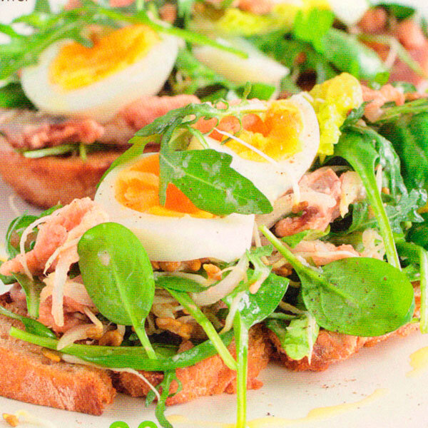 Время приготовления 20 минут ЧТО НУЖНО: ■ 3 яйца ■ 3 небольшие луковицы шалота ■ 4 ст. л. красного винного уксуса ■ 300 г филе скумбрии или горбуши горячего копчения ■ 150 г смеси листьев свежего салата КАК ПРИГОТОВИТЬ: 1 Яйца выложите в сотейник, залейте холодной водой и варите 8-10 минут после закипания. Готовые яйца остудите, очистите и нарежьте кружочками. 2 Шалот очистите и нарежьте полукольцами. Смешайте лук с уксусом и оставьте на 10 минут. 3 Скумбрию (горбушу) разберите на лепестки, перемешайте с салатом и хреном. Посолите, если нужно, и поперчите. Хлеб смажьте со всех сторон оливковым маслом и обжаривайте на сковороде по 2-3 минуты с каждой стороны. 4 Выложите на обжаренные тосты лук, на него — скумбрию (горбушу) с салатом, сверху кружочки яиц. Сразу подавайте. Конечно, скумбрия горячего копчения хороша сама по себе, особенно с ржаным хлебом. Но ее можно использовать и для приготовления салата. Только надо чуть-чуть погасить жирность рыбы. Например, маринованным в уксусе луко