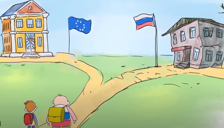 Далее мультфильм от отношений детей переходит к отношениям между странами, говоря, что подобная история произошла между братскими странами Россией и Украиной, когда Украина стала притеснять русское население в двух областях Донецкой и Луганской и эти области захотели перейти к России.