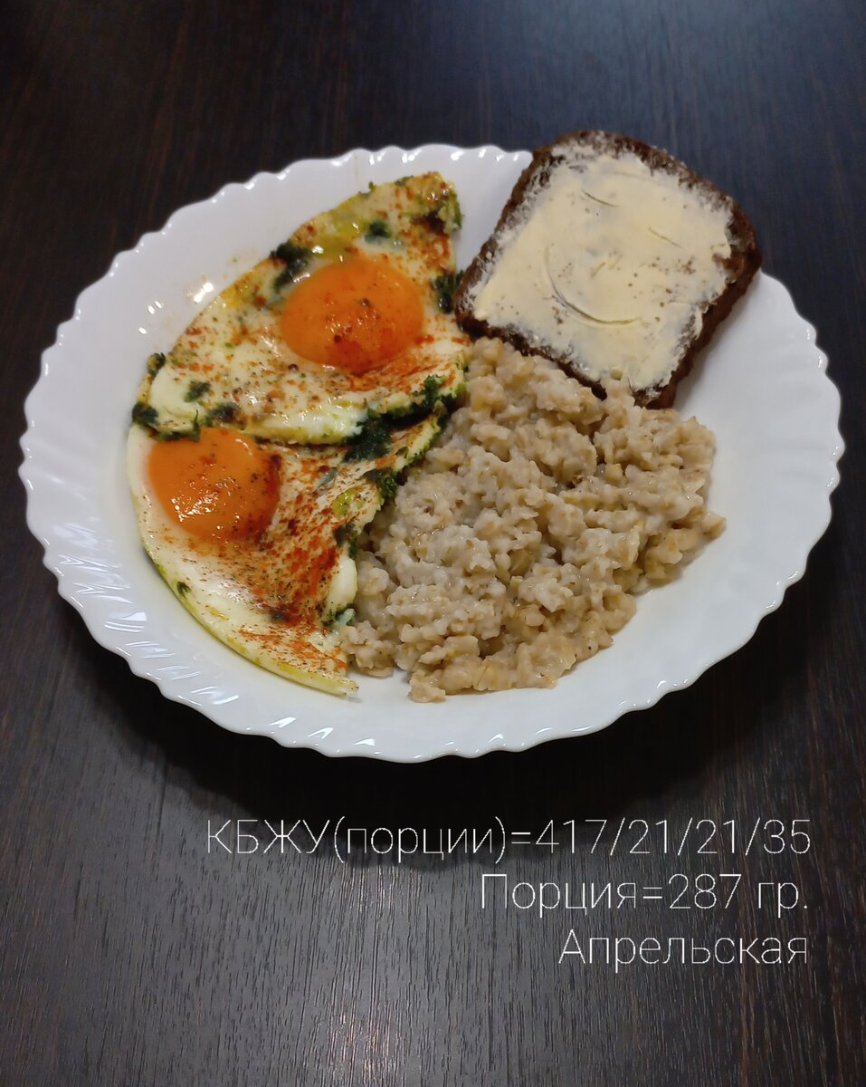 Сегодня у меня на завтрак: овсянка (долгой варки), сваренная на воде; яичница на масле ГХИ со шпинатом; бородинский хлеб со сливочным маслом.