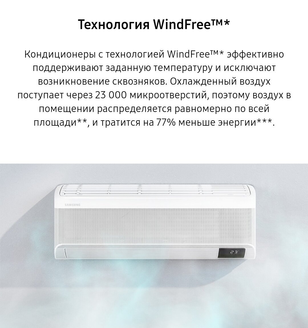 Приветствую, друзья. Вот и наступила весна. А значит пора позаботиться о кондиционере. Если у вас его до сих пор нет, то эта статья будет для вас полезной. В ней я дам вам ответ на вопрос - есть ли смысл в кондиционере с безветренным режимом. Такие кондиционеры выпускает компания Samsung. Технология называется Wind free. Вот как ее описывает сам производитель: "Кондиционеры с технологией WindFree™ эффективно поддерживают заданную температуру и исключают возникновение сквозняков. Охлажденный воздух поступает через 23000 микроотверстий, поэтому воздух в помещении распределяется равномерно по всей площади".