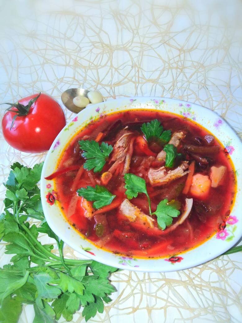 #меню #обед #фотоурокОтОльги #игры Так как я люблю фантазировать на кухне - то сегодня у нас необычный борщ🍲 Во - первых, два вида мяса🐔🐖. А так, как мясо постное, то зажарку сделала на шкварках курдюка🐏. Ну, и добавила цветную капусту🥦. Итог получился - 👌😋👍 Ингредиенты: куриная грудка, мякоть свинины или говядины, размером с грудку, свёкла, морковь, картофелины, луковица, соцветия цветной капусты, белокочанная капуста, чеснок, кетчуп, карри, соль , зелень петрушки, лавровый лист, укропа и петрушки, замороженные помидоры, курдючных шкварок, лимонного сока Способ приготовления: Мясо промыть и положить варить в кипящую воду (так будет меньше пены и бульон получится более прозрачным). Туда же положить стебли укропа и петрушки. Сварить мясо до мягкости. За 15 минут до готовности - посолить. Извлечь мясо из бульона, остудить и нарезать порционными кусочками. Стебли выкинуть. Морковь потереть на крупной тёрке, свёклу порезать брусочками, капусту тонко нашинковать. Лук порезать п/коль