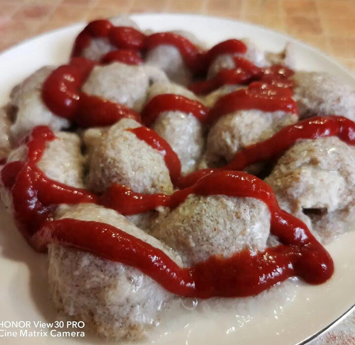 8. Кипяток - 200-250 мл. Смешиваем все сухие ингредиенты. Лучше предварительно муку, клетчатку перебить в кофемолка и пропустить через ситечко. В сухую смесь добавить кипяток (не горячую, а кипящую воду), постоянно вымешивая. Мешать, пока чуть не остынет (чтобы рука терпела). Затем добавить яйца. И всё месить минут 10, а потом убрать в холодильник на час. Фарш: Куриную грудку или другое мясо перемолоть в фарш. Лук, чеснок, соль, перец - по вкусу.
