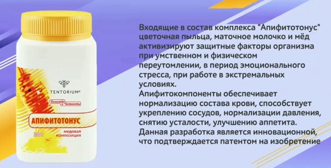 Медовая композиция Апифитотонус - это уникальное средство для поддержания здоровья в наиболее сложные периоды - весной и осенью, а также для питания организма и профилактики заболеваний. В состав меда Апифитотонус входят: Входящие в состав комплекса "Апифитотонус" компоненты (цветочная пыльца, маточное молочко и мёд) активизируют защитные факторы организма при умственном и физическом переутомлении, в период эмоционального стресса, при работе в экстремальных условиях. Апифитокомпоненты обеспечивает нормализацию состава крови, способствует укреплению сосудов, нормализации давления, снятию усталости, улучшению аппетита. Мед обладает противовоспалительными свойствами, снижает риск развития инфекционных заболеваний у детей и взрослых. Данная разработка является инновационной, что подтверждается патентом на изобретение. Апифитотонус обладает следующими свойствами: снимает усталость; улучшает память; улучшает сон - обладает естественными природными тонизирующими свойствами; повышает аппетит;