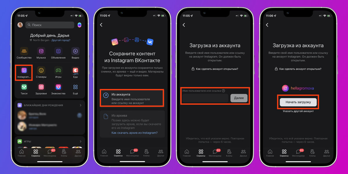 Вытащить данные можно и со смартфона, и с ПК. В социальной сети «ВКонтакте» появился новый официальный сервис — сохранение контента из Instagram, который с 14 марта на территории России. Чтобы воспользоваться новой функцией, перейдите по с компьютера, либо перейдите во вкладку «Сервисы» мобильного приложения «ВКонтакте» и выберите Instagram Manager. Введите название своей страницы (она должна быть открытой), после чего нажмите «Далее» → «Начать загрузку». Фотографии сохранятся в закрытый альбом (настройки доступа можно будет поменять позднее). Также возможна загрузка данных из архива Instagram. Такой вариант позволяет вытащить не только фотографии, но и видео и Reels — они сохранятся в разделы «Видео» и «Клипы» соответственно. Если у вас есть доступ к соцсети, сделайте следующее: После этого придётся подождать до 48 часов — из-за огромного количества запросов выгрузка данных происходит медленнее обычного. Когда архив придёт на почту, скачайте его на смартфон или компьютер и загрузите в