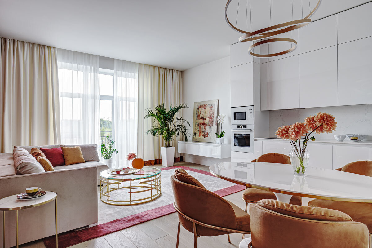 Это первое собственное жилье хозяйки квартиры, и она точно знала, каким оно должно быть: максимально комфортным, уютным, с определенными акцентами в каждой комнате, символизирующими атмосферу и настроение. Автор проекта: дизайнер Ирина Риф (дизайн-бюро RIF INTERIORS), г. Москва. Стилисты Ольга Харламова, Анастасия Уфимцева. Фото: Андрей Сорокин «У человека должно быть такое пространство, где каждая деталь интерьера дает силы и энергию» Для оформления общего пространства гостиной-кухни использовали обои из премиальной коллекции бельгийского бренда Arte. Это объемные обои из ткани и поролона с уникальным 3D-эффектом, которые тактильно напоминают алькантару и хорошо поглощают звук. Оптические иллюзии на стене создают ощущение движения, ритма. Пол выложен инженерной доской от Finex. Мебель и аксессуары — Kare Design, «Акценты». Мягкая мебель должна была быть максимально комфортной, стильной, с дополнительными спальными местами, поэтому все диваны изготавливали на заказ по эскизам дизайнера