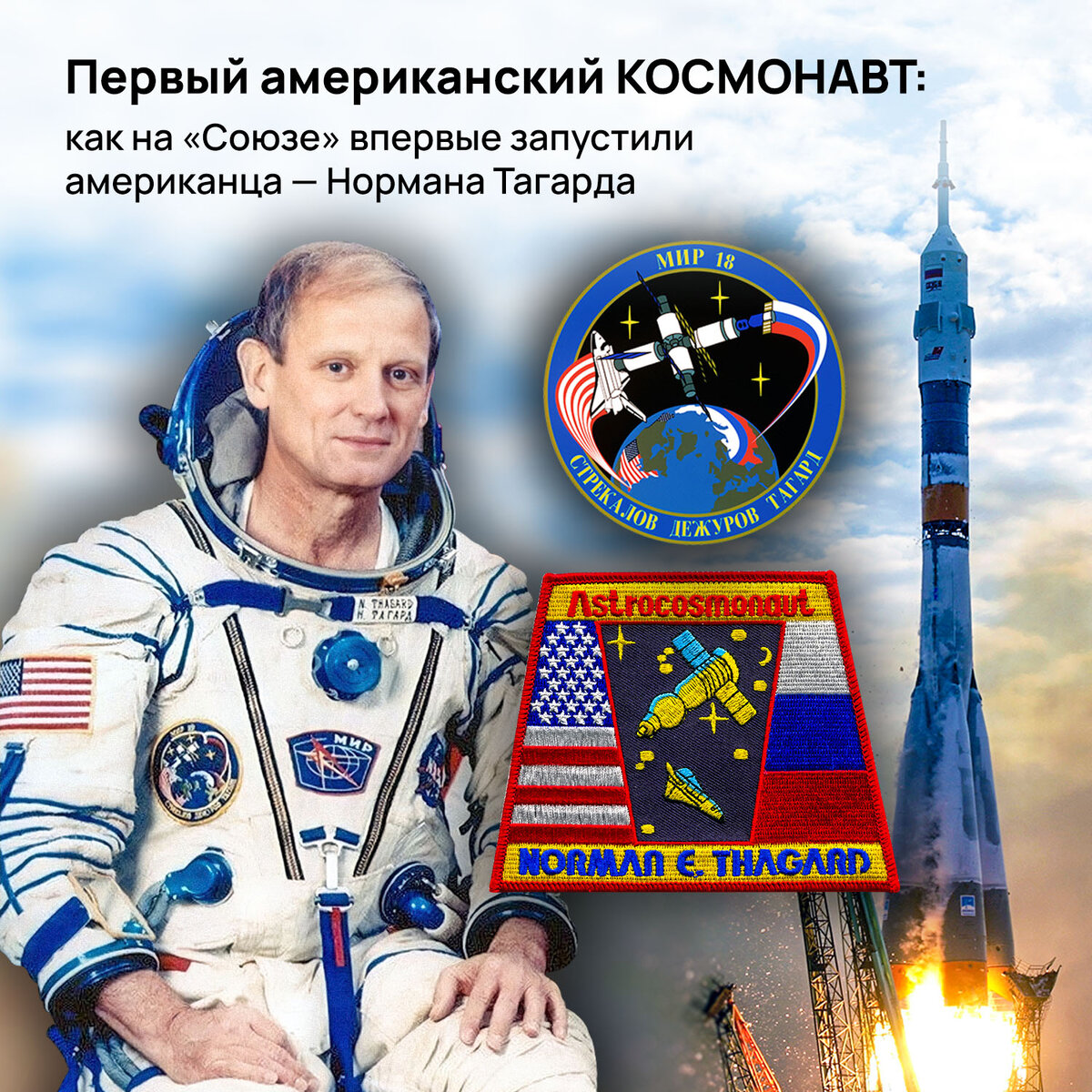 14 марта 1995 года с «гагаринского» старта космодрома Байконур стартовала ракета «Союз-У2». Она вывела на орбиту космический корабль «Союз ТМ-21». Это был далеко не первый и не последний международный полёт, но, тем не менее, он вошёл историю мировой космонавтики. Впервые на космическом корабле «Союз» присутствовал американец! Для Нормана Тагарда это был уже пятый космический полёт — он имел налёт около 25 суток аж на трёх шаттлах. Так что готовить с нуля его не пришлось. Но всё же первого американского космонавта (его так в шутку называли коллеги из NASA) подстраховали: — ракетой-носителем выступила более грузоподъёмная «Союз-У2», использовавшая синтин вместо керосина; — в бортинженеры взяли Геннадия Стрекалова, который имел опыт спасения на САСе. Основными задачами экипажа «Мир-18» были: — проведение совместных американо-российских медицинских исследований; — исследования эффекта невесомости; — реконфигурация станции для прибытия модуля «Спектр» и космического корабля «Атлантис». В х