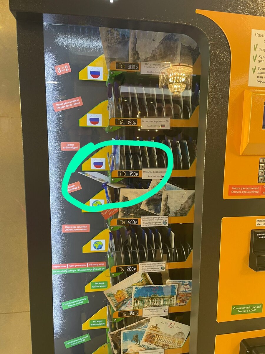 Раньше на каждый праздник мы получали бумажную открытку от родственников из других городов и даже стран. Лично мне грустно, что сейчас эта традиция исчезла. Поэтому из каждой поездки я отправляю открытку сама себе. И это очень приятно - получить открытку через время. Недавно со мной произошла милая история. Расскажу. В конце января 2022 года мы отдыхали с (уже мужем) в центре города Санкт-Петербурга в гостинице Москва. По случаю торжественного события накануне. И когда уже выезжали из отеля, наткнулись на вендинговый автомат по продаже открыток с видами Санкт-Петербурга. Да, такие автоматы у нас есть! Не задумываясь, купила, чтобы отправить себе домой. Открытка была сразу с маркой. Подписал и бросил в ящик! Было особенно приятно это сделать, так как накануне мы поженились. Но случилась неприятность. Открытка застряла в аппарате и не выпала. На нем, к сожалению, не был указан номер телефона. Да и такси уже подъехало. В общем, разбираться было некогда. Ушли ни с чем. По пути домой
