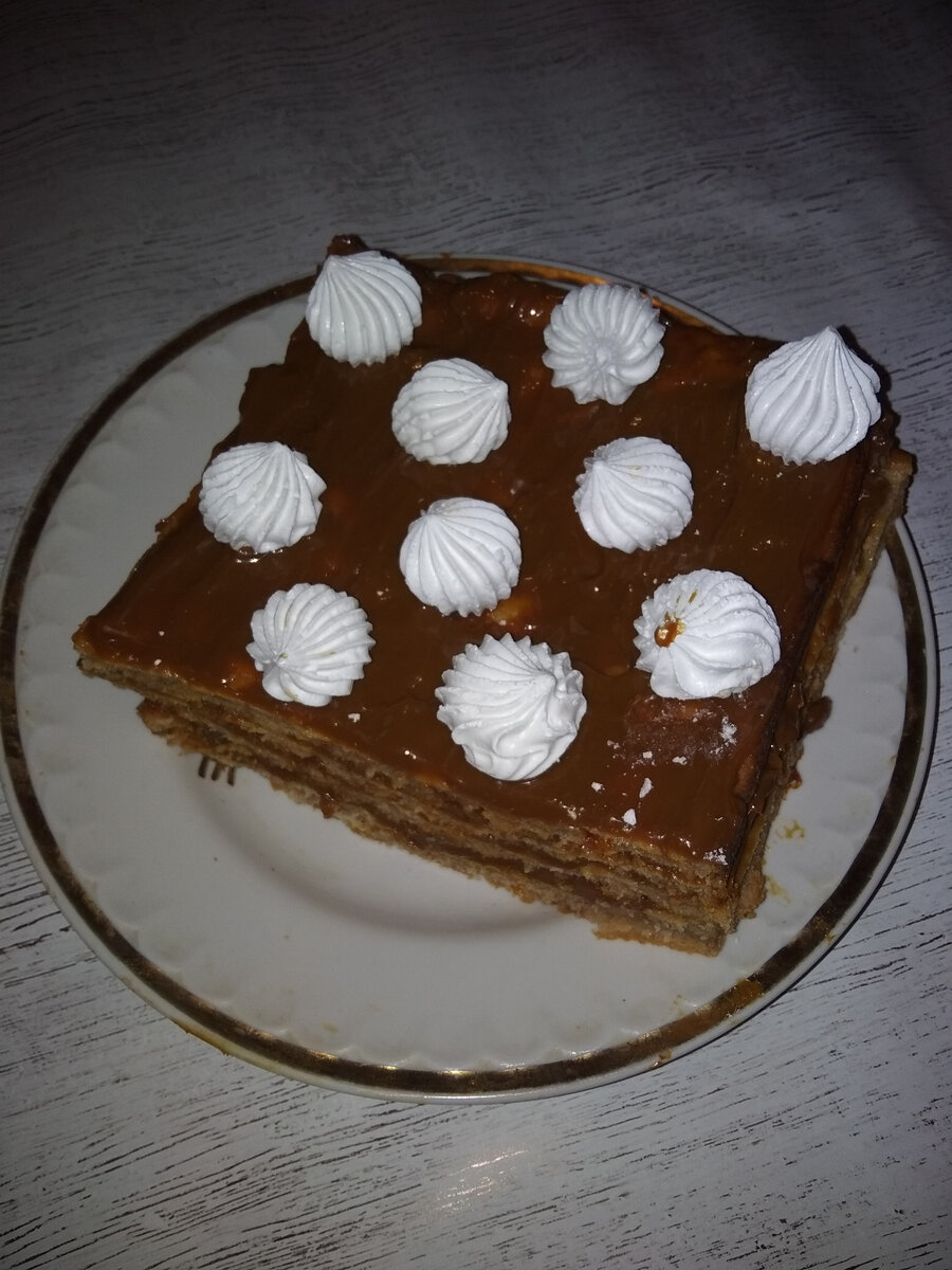 Состав теста: 1 стакан сахара, 1 стакан кефира, шепотка соли, 2 яйца, 1 стакан варенья (любого), 1 столовая ложка соды, уксусная кислота, 2 стакана муки, 2 столовые ложки масла или маргарина. Для крема: 1 стакан сметаны и полстакана сахара. Пол чайной ложки соды погасить уксусом и добавить в варенье. Пол чайной ложки соды погасить уксусом и добавить в кефир. Смешать эти 2 смеси. Сахар взбить с яйцами добела. Все смешать, добавить растопленное мало и постепенно просеянную муку. Духовку разогреть до 250 градусов. А когда будем ставить, то переведем до 200 градусов. Лист хорошо смажем маслом и присыпем мукой. Выльем тесто на лист. Выпекаем 10 минут. Готовность проверим лучинкой. Разрезаем в горячем виде на 4 части. Это и будут у нас слои торта. Подготовим крем. для этого хорошо взобьем сметану с сахаром. Смажем ею слои. Сверху можно украсить наш торт вареной сгущенкой и безе. Получается очень вкусно. ПРИЯТНОГО АППЕТИТА!