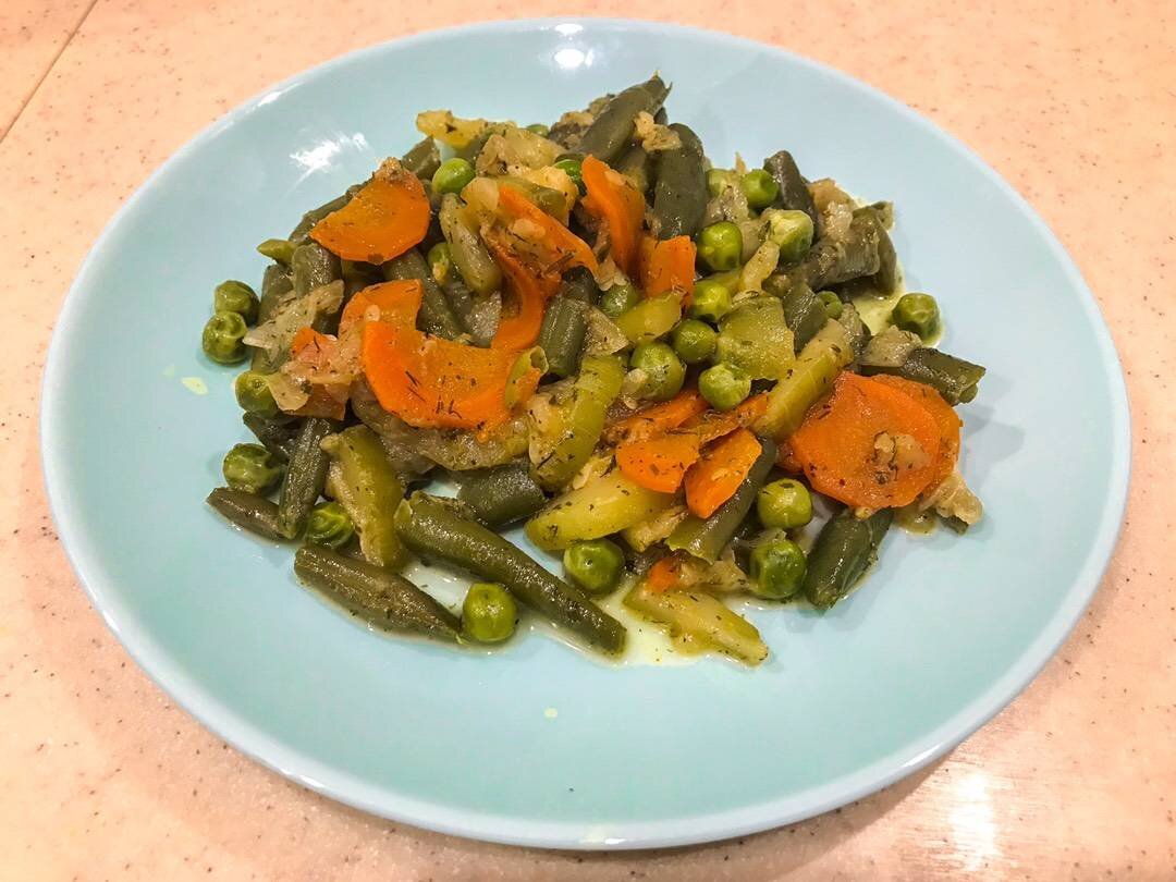#пост Ингредиенты: Лук, Морковь, Кабачок, Стручковая фасоль , Горошек , Соль, специи и приправы Способ приготовления: Нарезаем лук и тушим минут 5-7. Добавляем крупно нарезанную морковь и тушим ещё минут 5-7. Затем крупно нарезанные кабачки, солим по вкусу, добавляем специи и приправы. Перемешаем и тушим до готовности. В процессе будем ещё помешивать, но так чтоб не превращать в кашу. В конце добавляем горошек и стручковую фасоль. Тушим ещё минут 5. Я использовала замороженный. Приятного аппетита 👌🏻.