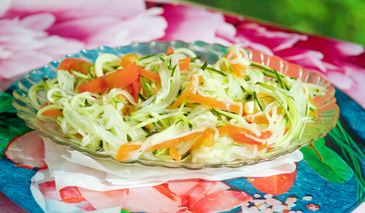 4. Масло растительное — по вкусу Берём небольшой молодой кабачок, предпочтительно цукини, отрезаем хвостики, нарезаем по всей длине ножом-экономкой, как для корейской моркови. Если внутри кабачка образовались семечки, то их вырезаем. Затем берём большой переросший огурец, счищаем кожу. Нарезаем с помощью ножа-экономки вдоль всей длины огурец. Далее мы добавляем болгарский перец, нарезаем его тонко по всей длине. Для остроты мелко нарезаем чеснок. Добавляем адыгейскую соль, сахар и уксус, перемешиваем. Масло добавляем только перед подачей на стол. Приятного аппетита!