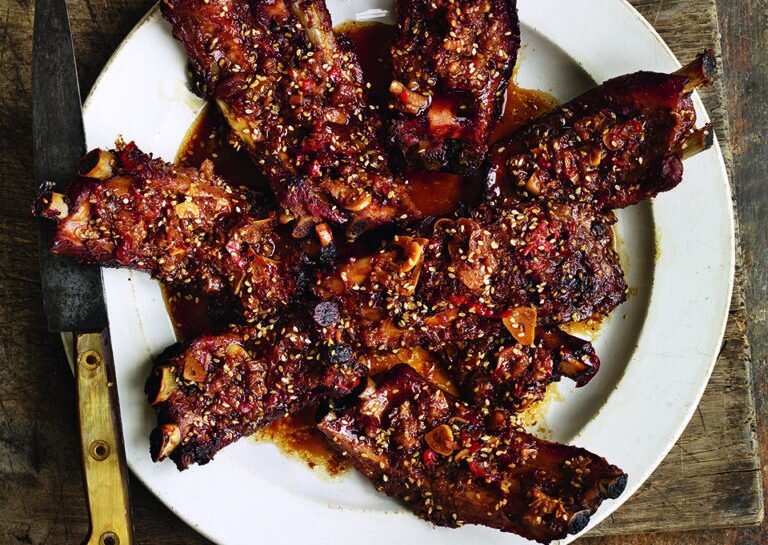 УГЛЕВОДЫ 12 Г Ингредиенты Приготовление Разогрейте духовку до 140°C/120°C. Положите ребрышки в большую форму для запекания, по возможности в один слой. Добавьте в блюдо небольшой стакан воды (около 175 мл) и приправьте ребрышки солью и перцем. Накройте ребра бумагой для выпечки, затем накройте все блюдо фольгой, убедившись, что вы плотно запечатали края, чтобы пар не выходил. Ставим противень в духовку и готовим 2-2,5 часа. Тем временем сделать соус. Нарежьте ревень на кусочки по 0,5 см и положите их в миску с имбирем, чесноком, перцем чили, измельченными семенами кориандра, сахаром, соевым соусом, яблочным соком и семенами кунжута. Хорошо смешать. Достаньте ребрышки из духовки, затем снимите с формы фольгу и бумагу для выпечки — к этому времени ребрышки должны стать красивыми и нежными. Увеличьте температуру духовки до 190°C/170°C .Выложите соус на ребрышки, убедившись, что они покрыты, затем поставьте блюдо обратно в духовку, не накрывая крышкой, и запекайте 30-40 минут. Соус начне