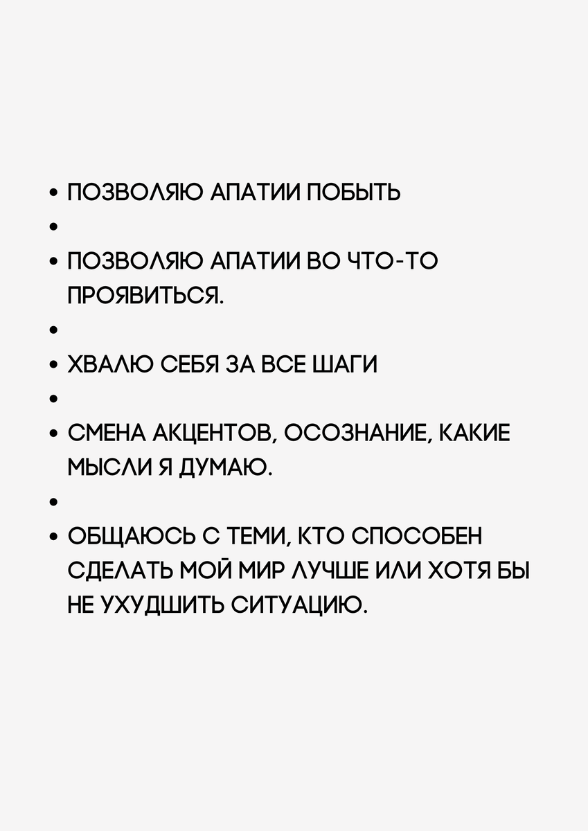 - Позволяю апатии побыть. Невозможно по клику живой организм заставить жить по-другому. Невозможно не чувствовать то, что чувствуется. Поэтому я в позиции наблюдателя позволяю себе переживать вселит эмоции, но не отключаюсь от жизни, которая есть вокруг меня. Не игнорирую приглашения друзей увидеться, но стараюсь делать все аккуратно и деликатно по отношению к себе.