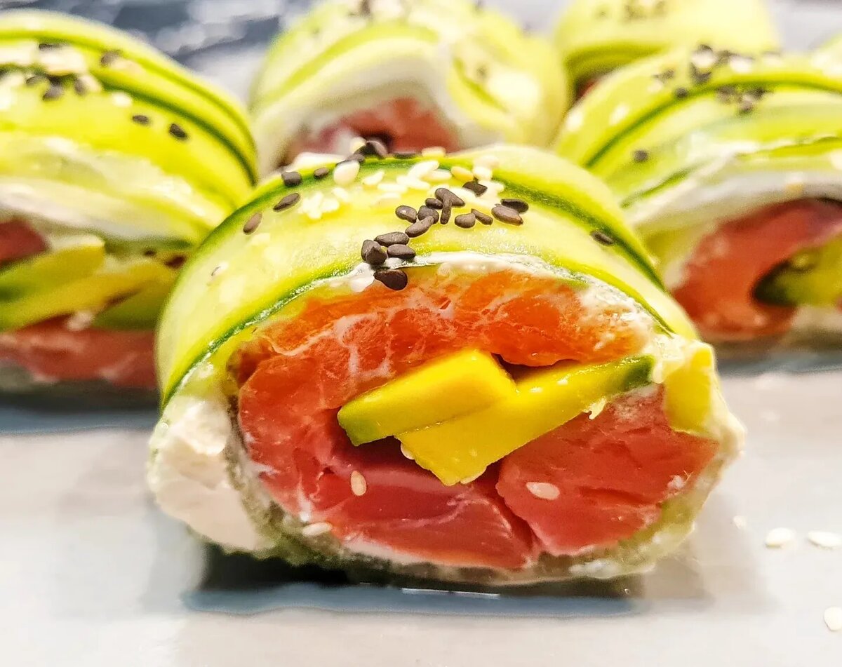 Это настолько вкусно, что попробовать должен каждый 😅 Этакий пп-ролл без, ну, или почти без, углеводов 😊 ✔️Берём длинный огурец, с помощью ножа для сыра нарезаем длинные тонюсенькие пласты и выкладываем на тарелку внахлест чуть-чуть друг на друга, таким образом выстелаем первый слой ✔️Обязательно промакаем салфеткой, чтобы убрать лишнюю жидкость ✔️Прокатываем творожным сыром весь пласт огурцов, оставляя совсем чуть на краю ✔️Выстелаем половину, тонко-нарезанной красной рыбкой ✔️Затем немного тонко-нарезанного авокадо ✔️Можно присыпать кунжутом ✔️Сворачиваем рулет, нарезаем, украшаем кунжутом Наслаждаемся 😍 #ппсуши #домашниесуши #домашниероллы #роллыбезриса #ппроллы #homecooking #быстроивкусно #galipanblog #galicooking