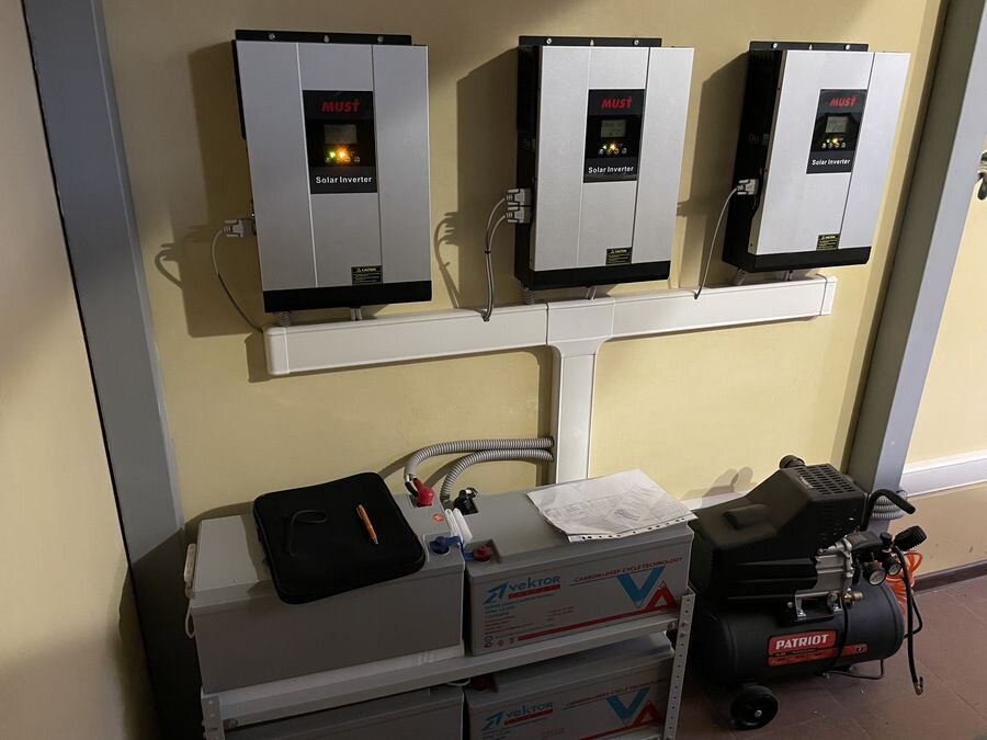 Данный комплект спроектирован, для исключения длительных и системных отключений электроэнергии. В дом заведено 3 фазы. Нагрузка распределена равномерно. Клиент решил не делить нагрузку и защитить от отключений весь дом. Сердце нашей системы инвертор MUST PV18-5048 VHM. С помощью модуля параллельного соединения мы собрали 3 фазы, поэтому все инверторы работают сообща. Так же что бы сохранить длительное пребывание на аккумуляторах, мы поставили 4 аккумуляторных батареи VEKTOR ENERGY VPbC 12-200 CARBON, что в совокупности дало 9 кВт\ч резерва.