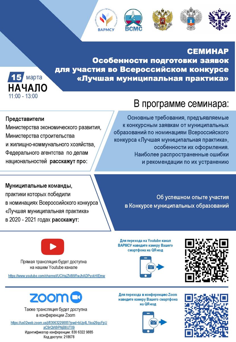 15 марта 2022 года состоится вебинар Всероссийского Совета местного самоуправления и Всероссийской ассоциации развития местного самоуправления по подготовке заявок для участия во Всероссийском конкурсе «Лучшая муниципальная практика» 15 марта 2022 года в 11:00 по московскому времени Всероссийский Совет местного самоуправления совместно со Всероссийской ассоциацией развития местного самоуправления проведут вебинар по подготовке заявок для участия во Всероссийском конкурсе «Лучшая муниципальная практика». В рамках мероприятия эксперты - представители Министерства экономического развития Российской Федерации, Министерства строительства и жилищно-коммунального хозяйства Российской Федерации, Федерального агентства по делам национальностей Российской Федерации разберут наиболее распространенные ошибки в подготовке документов конкурса и дадут рекомендации по заполнению заявок. Представители муниципальных образований, практики которых победили в номинациях Всероссийского конкурса «Лучшая му