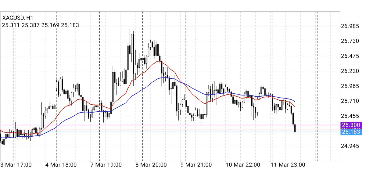 Серебро пробило уровень поддержки 25.30, и обновило минимум с 4 марта. Рекомендую торговать в продажу по этому инструменту до уровня 23.85.